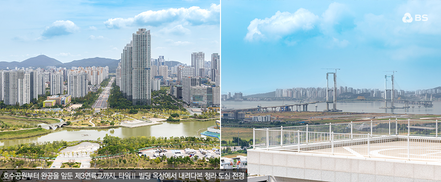 현재 두 타워를 잇는 스카이브릿지 공사도 진행 중입니다. 오는 10월 완공되면 두 건물을 자유롭게 오가며 청라호수공원부터 도심 전경까지 한눈에 감상할 수 있을 전망입니다.