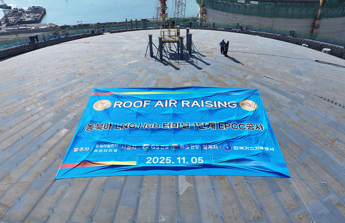 동북아엘엔지허브터미널㈜(이하 동북아엘엔지허브터미널)은 11월 5일, 여수시 묘도 소재 '동북아 LNG 허브 터미널' 건설 현장에서 LNG 저장탱크 지붕을 설치하고 이를 기념하는 상량식을 개최했다고 6일 밝혔습니다.