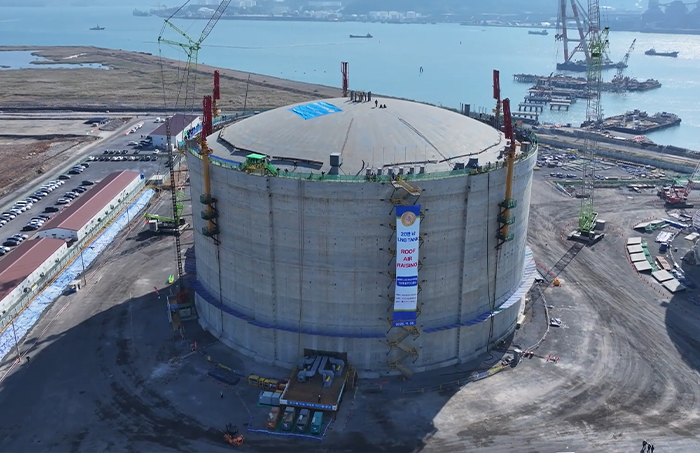 상량식은 LNG 저장탱크의 지붕을 설치하는 공정인데요. 이날 행사에서는 탱크 내부 바닥에서 제작된 대규모 지붕 구조물을 특수 공기압 시스템을 이용하여 위로 밀어 올린 후 용접을 통해 완전히 밀봉했습니다. 이 기술은 대형 저온 저장탱크 건설의 핵심 공정으로, 이후 LNG 터미널의 안정성과 운영 효율성을 좌우하게 됩니다.