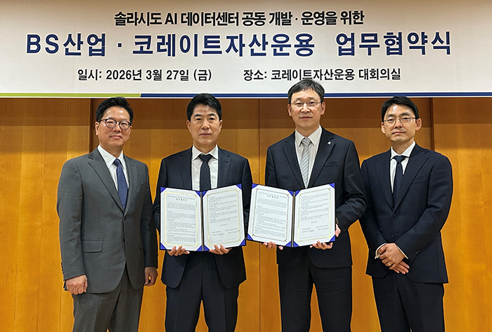 BS산업은 2026년 3월 27일, 코레이트자산운용과 '솔라시도 데이터센터 개발 및 운영을 위한 업무협약(MOU)'을 공식 체결했습니다. 협약식에는 BS산업 김만겸 대표이사와 코레이트자산운용 김치완 대표이사가 직접 참석해 향후 협력 방안을 함께 논의했습니다.