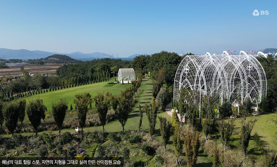 마지막 목적지는 해남의 대표 힐링 스폿, 산이정원입니다. '산이 곧 정원이 된다'는 이름처럼, 자연 지형을 최대한 보존하여 조성된 약 5만평 규모의 전남 최대 규모 민간 정원입니다. 1단계 구역에는 15개 테마정원과 미술관·카페·체험공간 등이 함께 운영되고 있습니다.