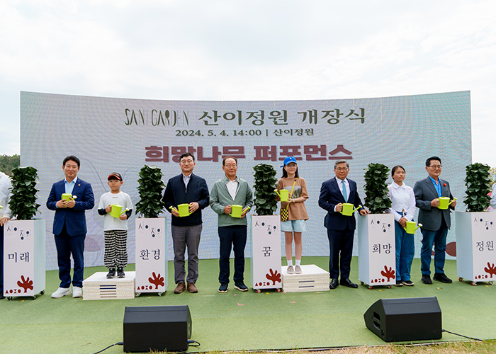 개장식에서는 이병철 아영 대표이사의 기념사에 이어 ‘희망나무 퍼포먼스’가 펼쳐졌습니다. 희망나무 퍼포먼스는 ‘미래세대’가 살아갈, ‘미래환경’을 생각하는 정원이라는 산이정원의 비전에 맞게 지속가능한 환경을 향한 미래 세대의 염원을 표현하는 이벤트였는데요. 내빈과 어린이가 함께 나무에 물을 주자 꽃이 피어나는 동시에 오색 연막탄이 터지며 전라남도 최초의 정원형 식물원의 시작을 화려하게 알렸습니다.