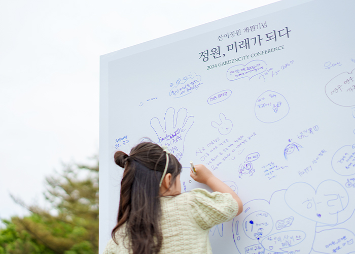 산이정원 개원 기념 보드에 한 어린이가 축하 메시지를 적고 있는 모습