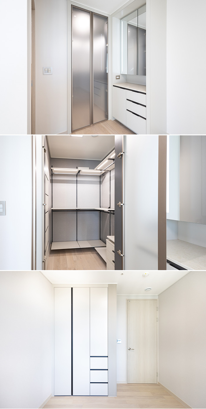 실내는 팬트리로 활용할 수 있는 다용도실과 실2(침실1)에 드레스룸이 있어 넉넉한 수납 공간을 제공합니다. 드레스룸 옆에는 라인 조명을 단 파우더룸과 샤워 부스 안 해바라기 샤워기 수전도 눈에 띕니다.