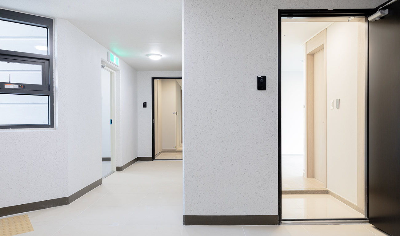 먼저 들어가본 곳은 84㎡B의 세대구분형 시설이었는데요. 엘리베이터에서 내리면 두 개의 문을 맞이하게 됩니다. 세대 분리형 아파트라는 점을 인지하지 못했다면 완전히 다른 집이라고 생각했을 정도로 출입구부터 철저하게 분리돼 있습니다.